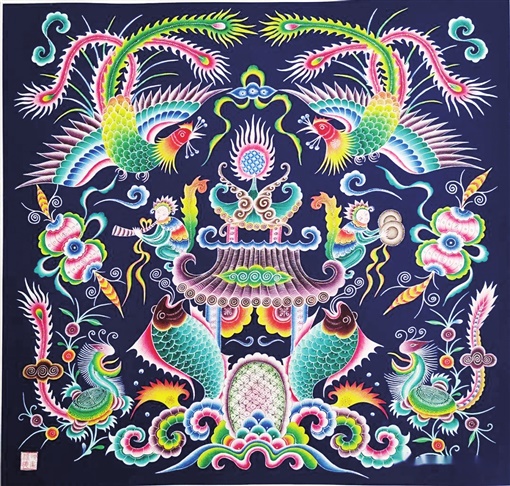 苗画,是吕洞山最美的色彩。它的颜色浓重而鲜艳,所画的往往是花鸟虫鱼、山川日月、龙飞凤舞,表达人们对于喜庆、吉祥、人寿、年丰的期盼。梁德颂尤其喜欢画龙画凤,因为龙和凤最能象征吉祥。在梁氏苗画工作室参观的过程中,一幅双凤图吸引了我们的目光,“这幅是叫《双凤朝阳》,寓意吉祥如意。”梁德颂介绍,这幅图是当世苗画经典之作,2009年一经问世就受到许多关注,并一举摘得当年“湘鄂渝黔边区民族民间旅游商品及民间工艺大师评选大赛”金奖。一时间,苗画名声大噪,而梁德颂也被授予“民间工艺大师称号”。2009年5月,冯骥才到湘西进行文化考察,给予梁德颂的苗画作品极高的评价,形容“保靖苗画是湘西的一张名片”。
