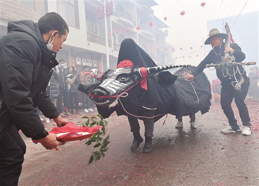 1月22日,正月初一,江永县源口瑶族乡,瑶民在走街串巷“耍春牛”。春节“耍春牛”是江永瑶寨的一项传统活动,瑶胞们通过活动祈求新年风调雨顺、五谷丰登。