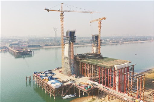 上图:1月28日,位于长沙市望城区的香炉洲大桥项目建设现场,施工人员在进行大桥主墩施工。当天,该项目各参建单位共有600多人复工,开启大桥建设高潮。湖南日报全媒体记者 田超 通讯员 卢松柏 摄影报道