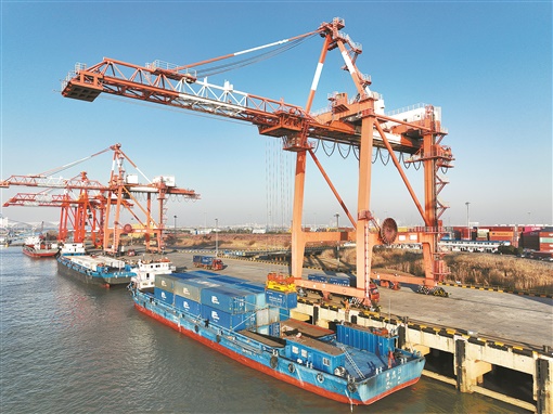 1月28日,货轮在江苏省扬州港集装箱码头进行集装箱装卸作业(无人机照片)。当日是春节假期结束后的开工第一天,各地企业铆足干劲、一派繁忙,奋力实现“开门红”。新华社 发