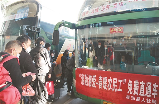 1月28日,桂东县汽车站,农民工有序登车。当天,桂东县“湘融湘爱·春暖农民工”点对点外出务工免费“直通车”启动,来自全县11个乡镇的522名农民工免费乘车前往广东东莞、深圳等地务工。邓仁湘 摄
