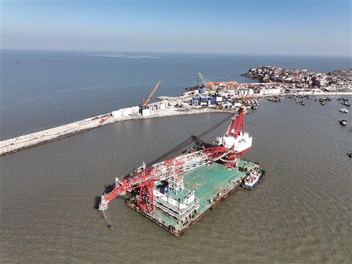 1月29日,在江苏省连云港市连岛国家级中心渔港,大型浮吊在海上作业(无人机照片)。春节假期过后,各地项目施工现场工人铆足干劲、一派繁忙, 建设项目“加速度”,奋力实现“开门红”。