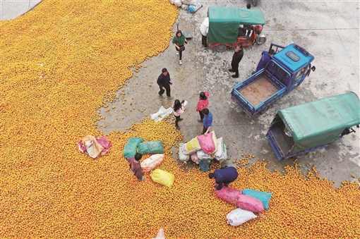 2月12日,江永县潇浦镇向光村,果农在销售夏橙。近年,该县引导农民发展夏橙、三月柑、沃柑等反季节水果,全县夏橙种植面积达4万余亩,年销售收入在3亿元以上。