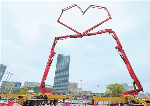 2月13日,长沙世界之窗广场,由两台三一泵车62米长臂摆出的“爱心”造型亮相。这枚高空中呈现面积达208平方米的红色“爱心”,象征着湖南工程机械在天灾面前将友爱互助的种子播撒世界。