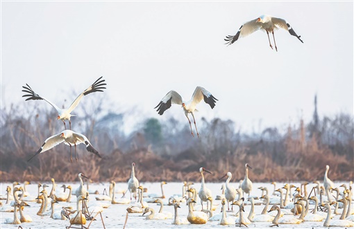 2月19日,岳阳市屈原管理区东古湖湿地。当天,记者在这里观察到103只白鹤。白鹤是国家一级保护动物,全球仅存5000多只。