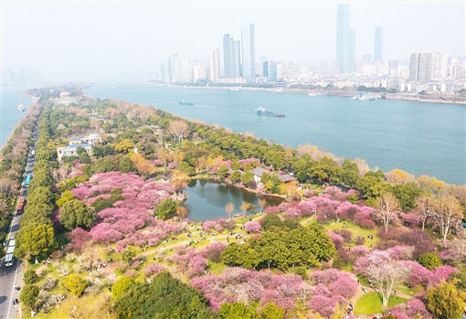 2月19日,长沙市橘子洲。近日,该景区梅园10多个品种700余株梅树竞相开花,吸引众多游客前来踏春赏花。