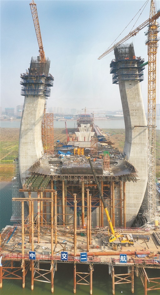 2月21日,位于长沙市望城区的香炉洲大桥项目建设现场,工人在进行大桥主墩施工。目前,该项目争分夺秒抢工期,建设现场热火朝天。香炉洲大桥主线长约3.24公里,通车后将成为长沙第14座(条)跨湘江过江通道。