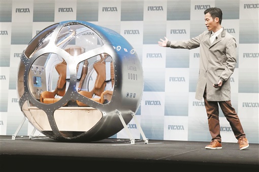 图为21日,日本岩谷技研公司CEO岩谷圭介在日本东京展示商业太空观光项目所用座舱——一个直径1.5米的鼓形塑料舱室。按照计划,这个舱室将与一个巨大的氦气球连接,搭载一名驾驶员和一名乘客从北海道升空,用时2小时上升至25千米高空,在此停留1小时,然后花1小时降落。新华社发