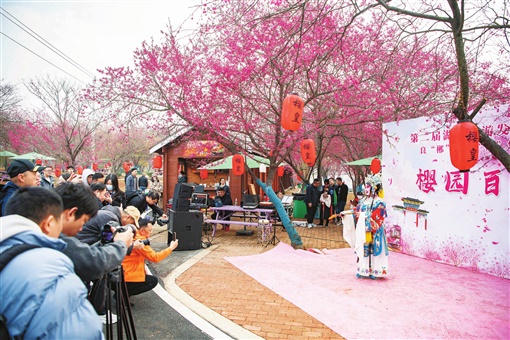 图① 2月22日,桂阳县农科所樱花园早樱迎春绽放,游客在观赏游玩。