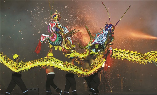 2月23日晚,吉首市乾州古城万溶江畔,民间艺人在表演“钢火烧龙”。当天,该市首届旅游发展大会暨第九届吉首鼓文化节活动之“钢火烧龙”非遗民俗表演在乾州古城水上舞台举行,彩龙飞舞,“钢花”绽放,吸引众多市民和游客前来观赏。