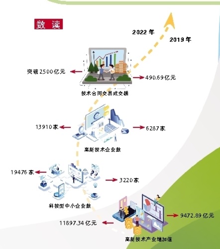 2022年,全省高新技术企业净增2847家、总数达13910家,科技型中小企业增加8075家、总数达19476家,技术合同交易成交额突破2500亿元、实现翻番,高新技术产业增加值增长12.7%,高出GDP增速8.2个百分点。