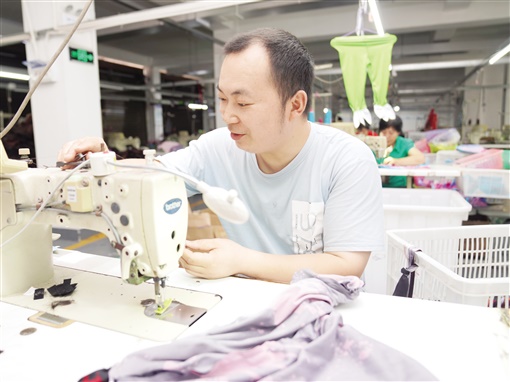 在龙升社区的龙池玩具帮扶车间,搬迁户滕园和同事们正在赶制一批出口服饰。