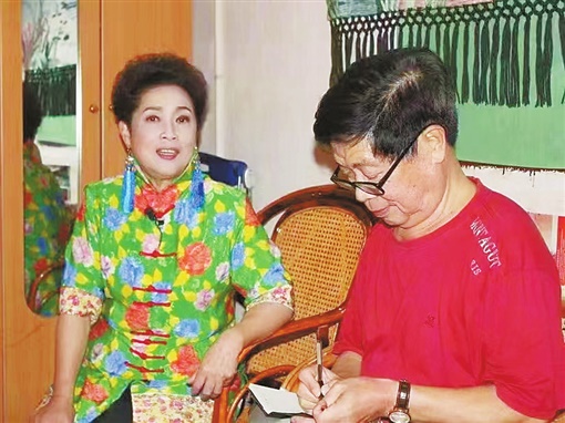 虽然“刘三姐”已经做了奶奶,但依然是眉如远山秀,眼如秋水波,神采飞扬,歌声甜美。临别时,她和丈夫在我的采访本上题写了本文开头所述的题词,还赠给我有他们签名《歌仙刘三姐》盒带,里面还刻录了他们夫妻俩演唱的湖南花鼓戏《刘海砍樵》唱段。