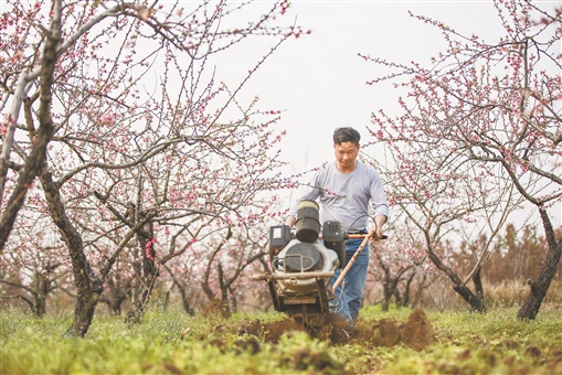 3月6日,蓝山县塔峰镇东江村,果农在桃园里驾驶农机翻耕土地。连日来,该县广大果农们抢抓农时积极开展翻耕、追肥等春季果园管理,为全年水果丰收打好基础。 彭华 摄