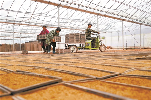 3月9日,祁东县白鹤街道百家居委会,村民在育秧基地忙碌。近年,该县推进水稻生产“订单式”育秧服务,既节约了育秧成本,又提高了育秧效率,为粮食增产、农民增收提供了有力支撑。陈延上 摄
