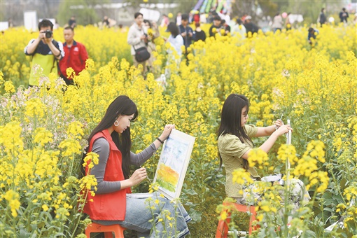 3月9日,湖南湘江新区含浦街道沃之园农庄,美术爱好者在油菜花地中画画。当天,“春暖湘江 花漾新区”2023湘江新区花乡生活节暨第八届含浦油菜花节开幕。