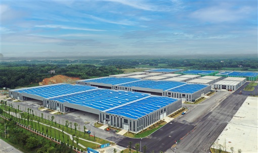 俯瞰中非工贸产业园,一栋栋标准化厂房被浓翠包裹。一旁,是奔涌不息的长江,见证着临湘高新区的发展速度。