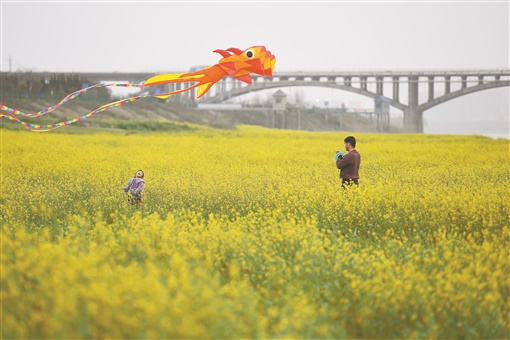 3月12日,长沙市湘府路大桥和黑石铺大桥间的湘江东岸,大片的油菜花盛开,吸引了许多市民前来踏青赏花,感受春日之美。