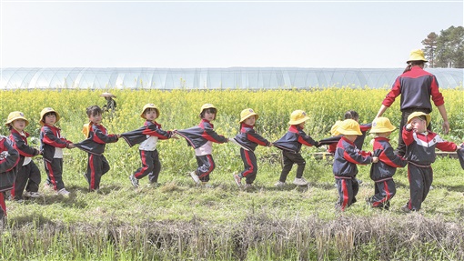 3月14日,常宁市兰江乡元山村,一群小朋友在老师的带领下在乡间田野玩耍。