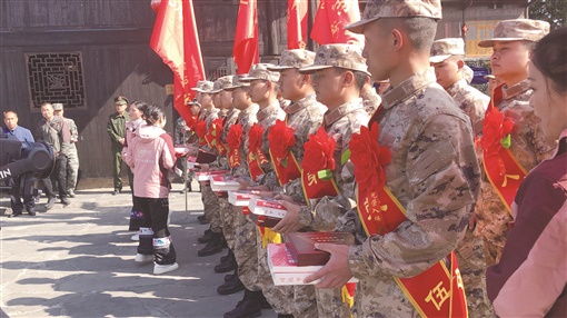 3月14日,花垣县新兵欢送仪式在双龙镇十八洞村举行,湖南国强文化公司驻村志愿者向每位新兵赠送了《习近平谈治国理政》等书籍,激励大家加强学习,苦练本领,争做新时代好战士。石莲芯 摄
