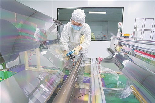 3月21日,宜章县经济开发区产业承接园,谱特光电科技有限公司员工在赶制国内外偏光片订单。近年,该县在优化营商环境的同时成立光电产业协会,依托会员单位以商招商,延伸产业链,致力打造百亿光电显示产业集群。