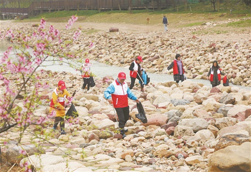 3月22日,党员志愿者在清理河畔卫生。当天,张家界市武陵源区的党员志愿者来到城区索溪河开展“清河净滩爱家园”巡河护河服务,以实际行动保护好水资源。