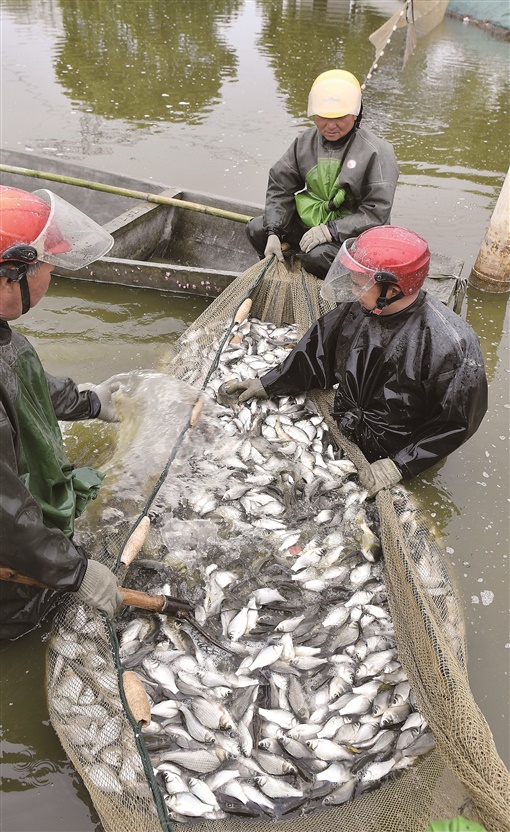 3月28日,长沙市望城区靖港镇,合池农业发展有限公司标准化养殖池塘,工人在捕捞合方鲫。该公司辐射带动水产养殖户648户、养殖面积近20万亩。