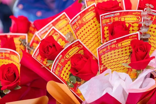 活动现场,湖南省福利彩票发行中心用中国红营造了简约喜庆的环境,十分切合国潮范。湖南福彩还为现场的每一对新人精心准备了一份特别的“贺礼”——仪式感满满的刮刮乐花束,让他们感受到福利彩票带来的幸运和惊喜。花束内分别是“喜相逢”、“好运十倍”等刮刮乐产品,喜庆的颜色蕴含着团圆、美满的寓意。这个举动不仅烘托了国潮集体婚礼的喜庆气氛,也让更多的人体验到福彩即开型彩票的乐趣,传递了“公益、快乐、创新”的福彩文化,是“福彩+”跨界融合的又一次双赢。