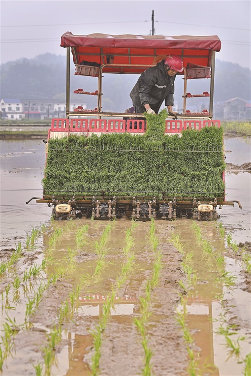 3月29日,浏阳市龙伏镇,种粮大户在进行早稻机插秧作业。今年,龙伏镇出台储备育秧奖补措施,充分调动农民的种粮积极性。