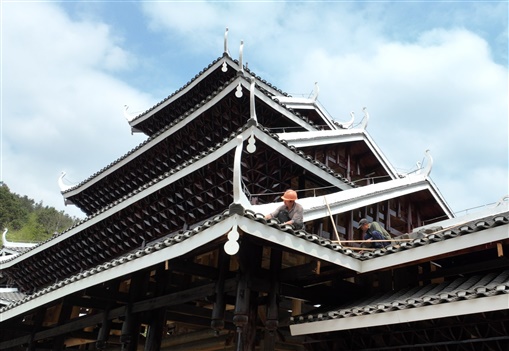 4月1日,通道侗族自治县皇都景区新寨门施工现场,工匠在为新建的鼓楼铺瓦。今年来,该县抢抓文旅市场复苏机遇,做足“绿色、红色、古色、夜色”文章,一大批文旅项目陆续开工建设。