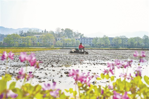 4月7日,双峰县青树坪镇归古新村,启富农机合作社出动4台旋耕机和2台微耕机,对1500亩水田展开机械化作业。