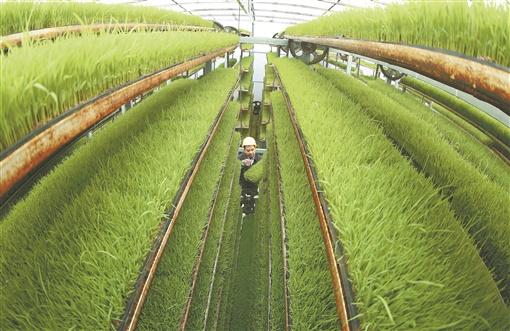 4月7日,衡东县大浦镇机械集中育秧中心,农技人员在查看早稻育秧生长情况。仲春时节,当地农民抢抓农时开展春耕生产,为全年农业丰收打好基础。曹正平 颜伶俐 摄影报道