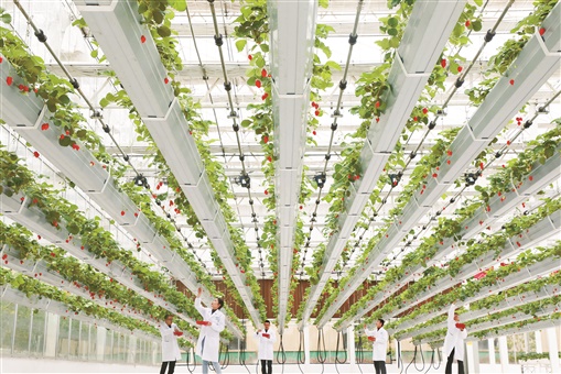 4月6日,东安县白牙市镇工业园的智慧农业大棚,员工在采摘草莓。近年来,该县大力发展智能恒温滴灌和立体无土栽培的智慧农业,实现农业规模化、产业化、精准化发展。