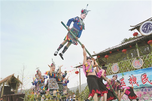 4月9日,通道侗族自治县坪坦乡下盘村,演员在表演民俗节目。当天,侗族群众和游客欢聚在一起,庆祝当地一年一度的“占匹拽民俗文化节”。近年来,该县打造了一批体验式、互动式民俗节庆品牌,推进文化和旅游深度融合。杨芝干 摄