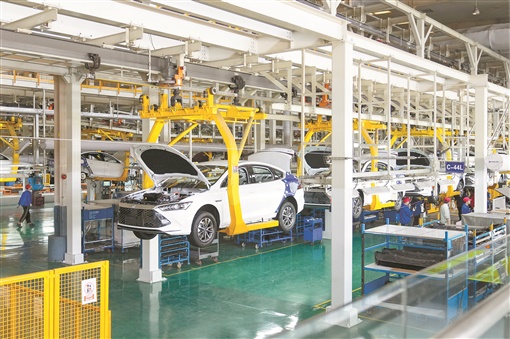4月8日,比亚迪长沙基地总装车间,工人在新能源汽车生产线上忙碌。今年1至2月,比亚迪新能源汽车产量增长1倍。