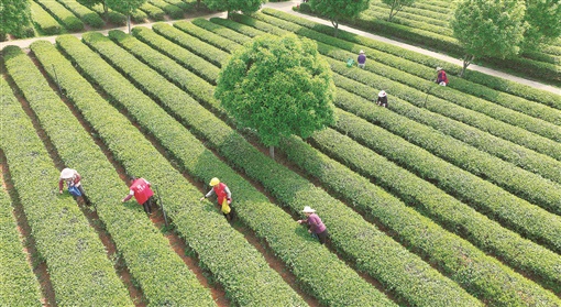 4月11日,长沙市望城区乌山贡茶基地,茶农在采摘春茶。眼下正是春茶采摘、制作的忙碌时节,该基地1260余亩茶园进入春茶采制旺季,预计今年茶叶产量3万公斤左右。