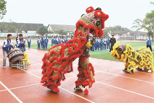 4月11日,江永县第二中学,学生在练习舞狮。今年,该校在课后服务中开设舞狮课程,鼓励学生学习和传承传统文化。田如瑞 摄