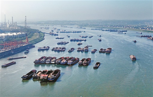 4月16日,湘江湘潭段水域,一艘艘货船在航道上有序航行,一派繁忙。