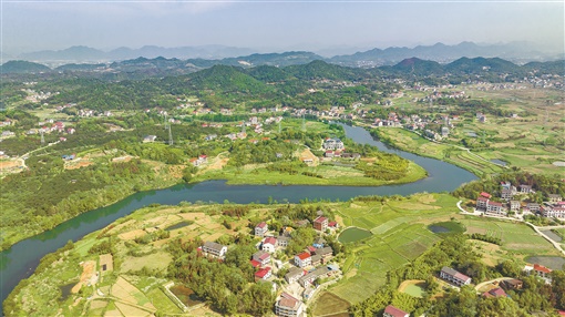 4月17日,娄底市娄星区石井镇松江村,蜿蜒的河流、错落的民居与渐绿的田野相互映衬,构成了一幅美丽的田园春景图。