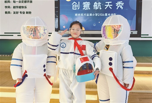 4月24日是“中国航天日”,长沙市天心区湘府英才益清小学,一场别开生面的太空环保时装秀火热举行。T台上展示的各式“宇航服”均由学生、老师、家长共同设计,并利用生活中废弃材料制作而成。