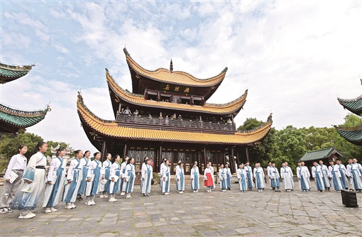 4月27日,岳阳市岳阳楼小学学生在岳阳楼下诵读《岳阳楼记》。近年来,该校秉承“承千年文脉、育忧乐少年”办学理念,依托名楼文化开展教育实践活动,让学生传承传统文化,在经典中浸润成长。 湖南日报全媒体记者 田超