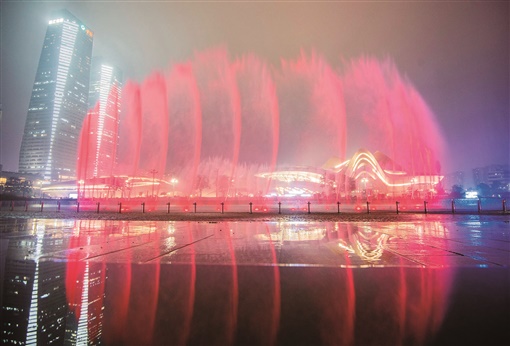 5月10日晚,长沙梅溪湖的喷泉伴随着音乐律动,与绚丽灯光融合变幻出多彩水幕,为参加2023世界旅游城市联合会长沙香山旅游峰会的嘉宾带来一场视觉盛宴。湖南日报全媒体记者 李健 摄