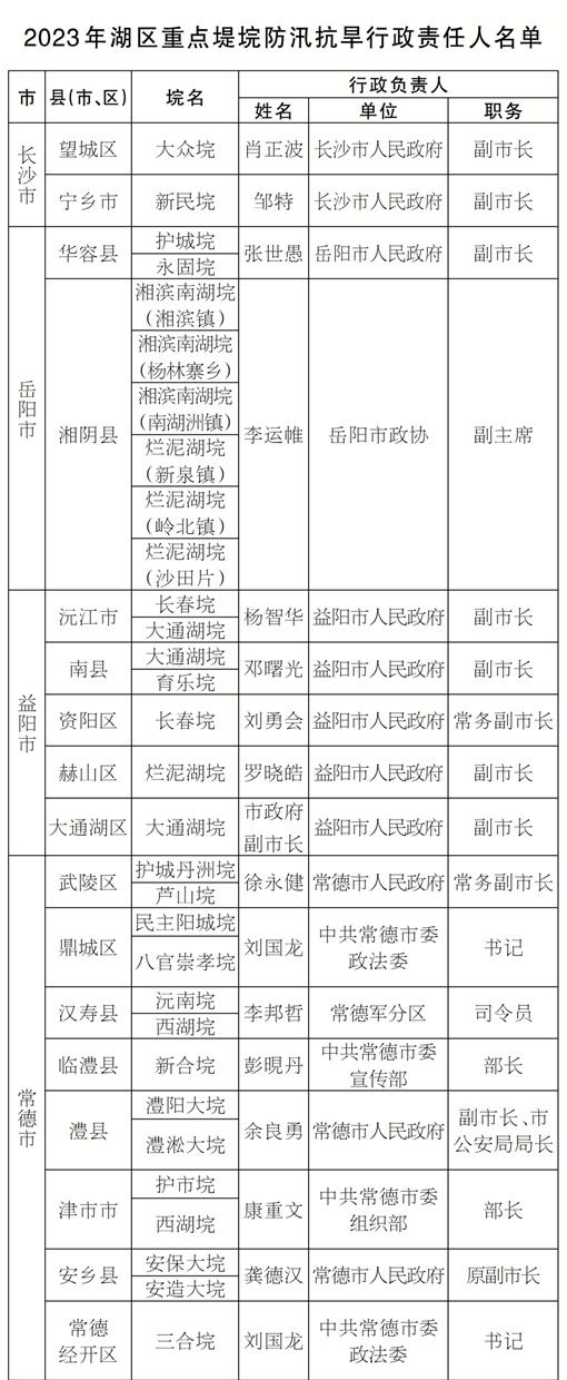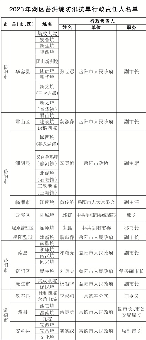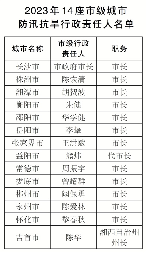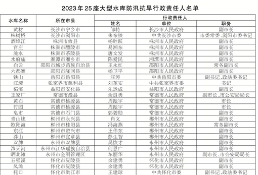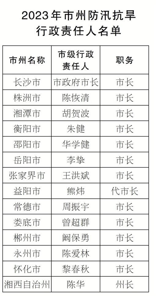 根据《中华人民共和国防洪法》《中华人民共和国防汛条例》《中华人民共和国抗旱条例》关于防汛抗旱工作实行各级人民政府行政首长负责制的规定,现将全省市州、市级城市(特指城区)、大型水库、湖区重点堤垸、湖区蓄洪垸防汛抗旱行政责任人名单予以通报。