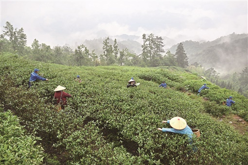 5月10日,资兴市黄草镇雷公仙村,村民在采摘高山云雾茶。该村位于东江湖畔,曾是有名的矿区。为保护好东江湖水源地,资兴市关闭湖区所有矿山,引导当地群众发展生态茶叶、水果种植,实现产业转型,绿色发展。