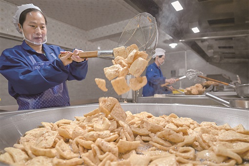 5月11日,新田县金盆镇河山岩村金盆湖富硒生态农业开发有限公司,工人在制作“新田醋水豆腐”。近年来,该县利用土地富硒资源优势,大力发展国家地理标志产品“新田大豆”产业。今年,全县种植大豆65000余亩,可带动两万余名农民实现在家门口务工增收。