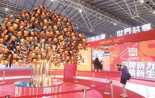 5月12日,2023年中国品牌博览会“创新100﹢”展区,参观者在一个由OLED柔性屏组成的“品牌树”下观看拍摄。这棵“品牌树”上的每一片“叶子”都是一片柔性屏幕,讲述着一个品牌故事,成为本届品牌日的一大亮点。湖南日报全媒体记者 赵持 摄