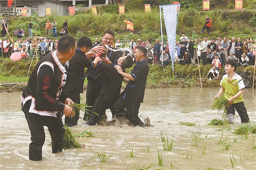 5月21日,村民在喝秧酒。当天,湘西土家族苗族自治州第六届农耕民俗文化节在保靖县毛沟镇排当村举办。土家族群众按照传统“开秧门”习俗,开展了插秧头、喝秧酒、糊秧门等活动,欢度农耕节。