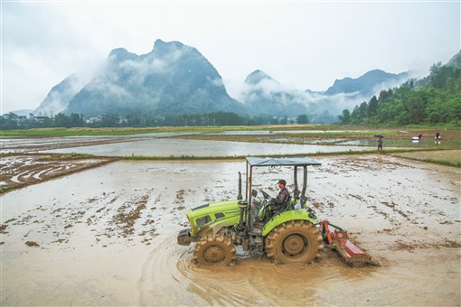 5月21日,龙山县召市镇前卫村,农民在冒雨耕田。小满节气前后,该县进入水稻种植繁忙季,田间地头到处都是农民耕地插秧的忙碌身影。 曾祥辉 摄