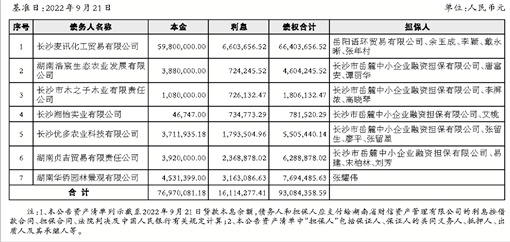 根据湖南银行股份有限公司湘江新区分行与湖南省财信资产管理有限公司达成的债权转让安排,湖南银行股份有限公司湘江新区分行将其对下列公告资产清单所列债务人及其担保人享有的主债权、担保合同项下的全部权利及相关附属权益(包括但不限于保证权利、抵押权、质押权等)依法转让给湖南省财信资产管理有限公司。湖南银行股份有限公司湘江新区分行特公告通知各债务人、担保人以及债务人、担保人因各种原因发生更名、改制、歇业、吊销营业执照或丧失民事主体资格等情况的相关承债主体或清算主体。