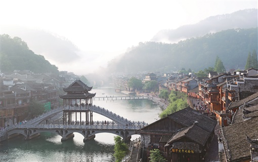 5月24日清晨,凤凰古城沱江河上云雾缭绕,轻纱曼舞。 滕建康 摄
